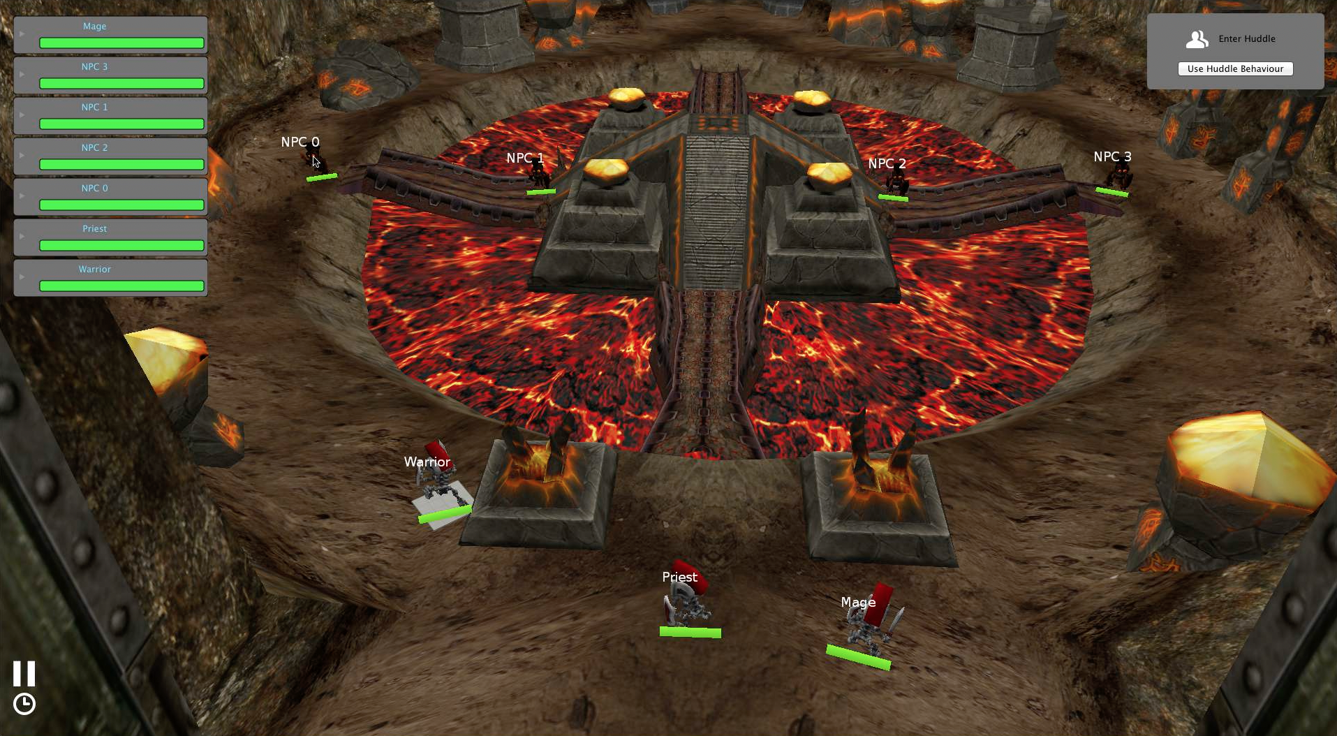 The learning component uses a simulation of the real game, with models of the non-player characters created from the observed behaviours of those characters, in order to evaluate candidate solutions. When a solution is found, the player is given the opportunity to take it to the real game and have the behaviour of his characters replaced by the combined strategy created by himself and the huddle.